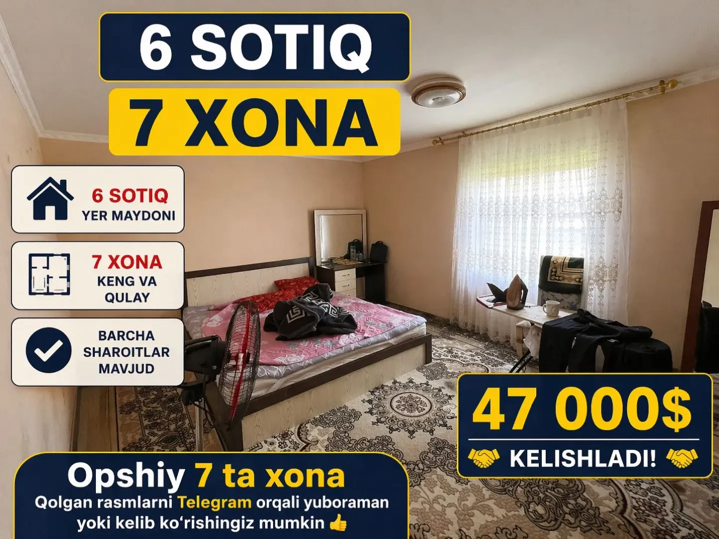 Uyda jami 7 ta xona bor. 7-xona ko‘cha tarafda joylashgan bo‘lib, oldin do‘kon sifatida ishlatilgan. Xohlasangiz, o‘zingizga moslab o‘zgartirib olishingiz mumkin. Xonalari hamasni rasmni telegram orqali tashab beraman yoki kep korsez boladi