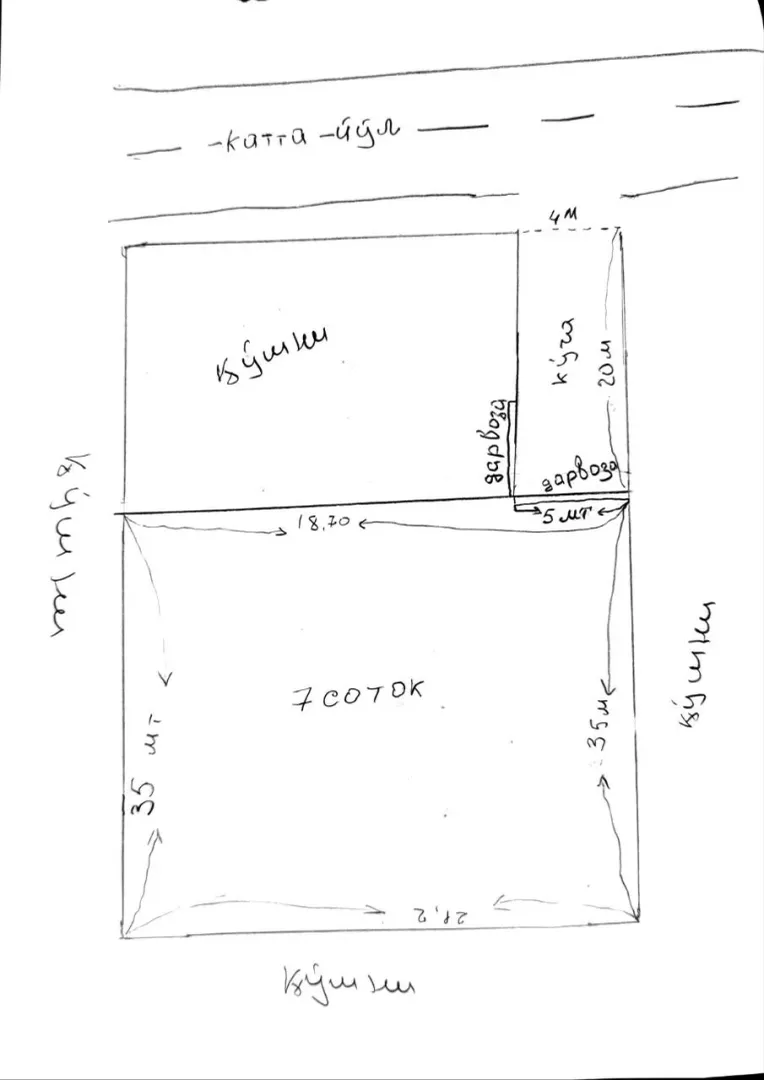 Сергелийски раён улица Ханабад продается земельный участок 15500 сотка. Если с домом 16000 сотка 6 комнаты участок по рисунку почоркнута все детали документы имеются по остальным информацию можно обсудить по телефону вся коммуникации имеется